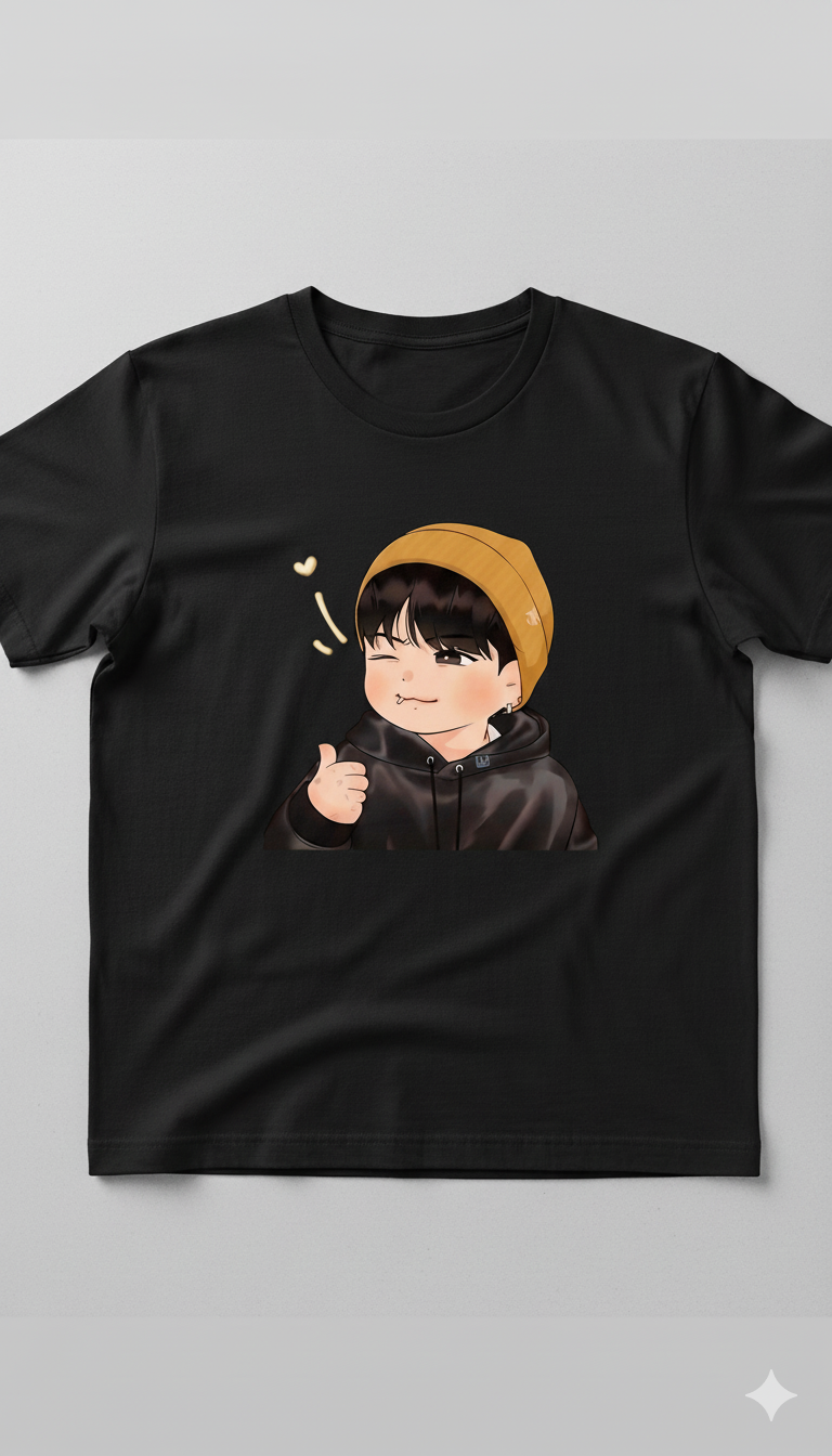 Celebrate your love for BTS with this stylish and comfortable Jungkook animated t-shirt. Featuring a high-quality animated print of Jungkook, this black tee is a must-have for every true fan.